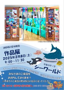 2025.01.29 令和7年2月8日(土)に作品展「あけのほシーワールド」を開催します! 令和7年2月8日(土)に作品展を開催します! 今回のテーマは「シーワールド」です。 時間:9:00~11:30 ※ご都合の良い時間にいらしてください。 ただし、在園家庭の方は担任によるガイドがありますので指定された時間においでください。 ※駐車場をご利用いただけます。 ※すいーつばたけのクッキーの販売があります。(数に限りがあります。) 子どもの達の個性豊かな作品をぜひ見にいらしてください♪