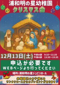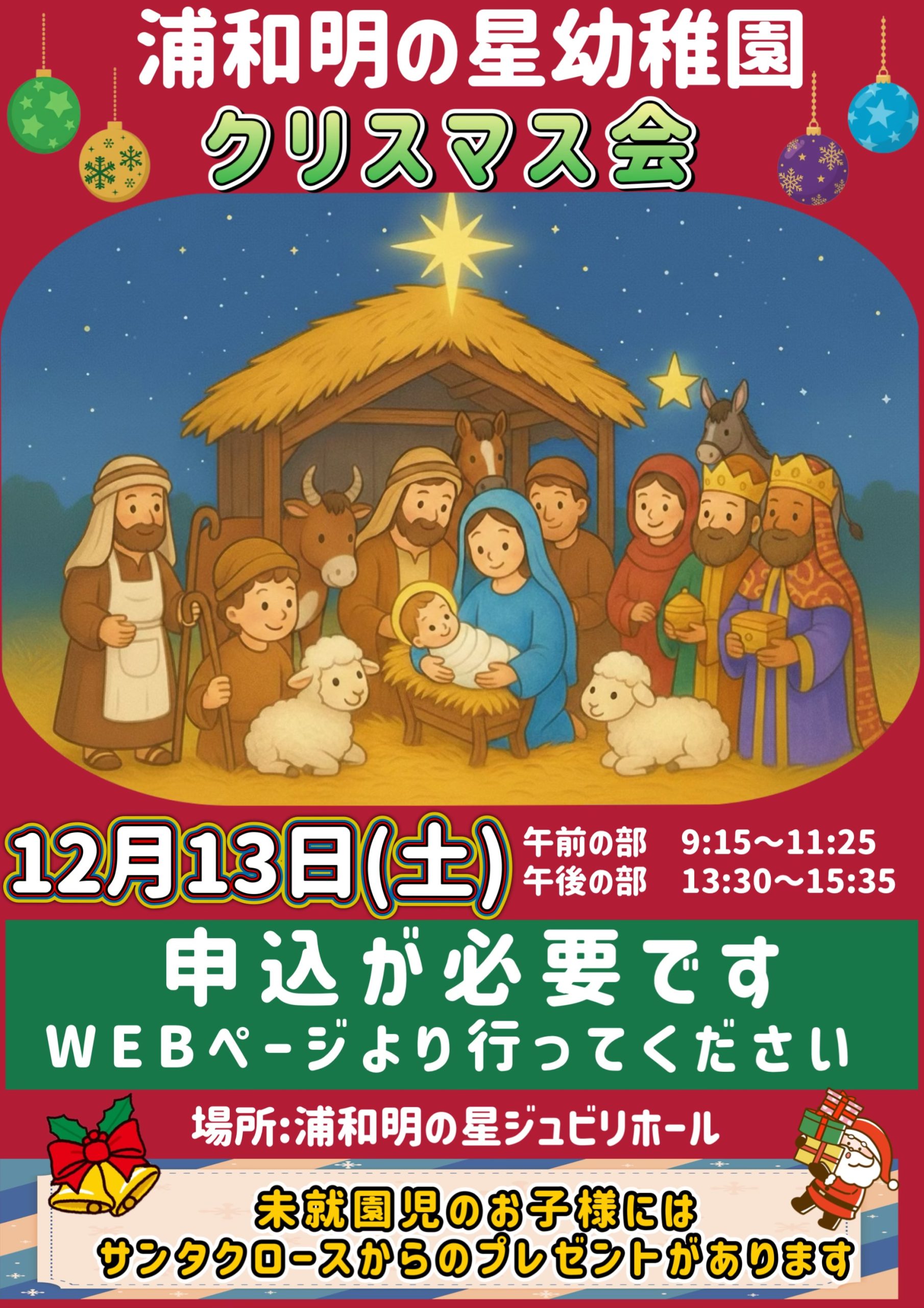2025.11.20 ★令和7年12月13日(土)にクリスマス会を行います。どなたでもご参加いただけます!未就園児にはサンタさんからプレゼントがありますので、ぜひいらしてください。 日にち:12月13日(土) 時間:午前の部9:15~11:25 午後の部13:30~15:35 午前の部、午後の部ご都合の良い時間にいらしてください。 詳しくはこちら 申し込みフォームはこちら