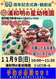 2025.10.12 11月9日(日)60周年記念式典・観劇会を行います★ 在園児だけでなく、卒園した小学生、未就園児、地域の方もご覧いただけます。注意事項をよく確かめてフォームから申し込んでください。 受付時間:9時20分~9時50分 持ち物:上履き、外靴を入れる袋 【申し込み】 卒園児・地域の方(「れんらくアプリ」ご登録以外)の お申込みはこちら 在園児・未就園児クラス在籍の方(「れんらくアプリ」ご登録)は 後日配信される、「れんらくアプリ」のアンケートより申し込みを行って下さい。 ※恐縮ですが、未就園児、卒園児、地域の方の駐車場は、ご用意できません。徒歩又は自転車でご来場ください。